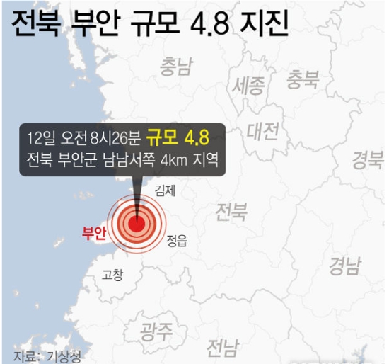 이미지 확대보기기상청에 따르면 지진 위치인 진앙은 북위 35.70도, 동경 126.71도다. 행정구역으로는 전북 부안군 행안면 진동리다. 진원의 깊이는 8km로 추정됐다.