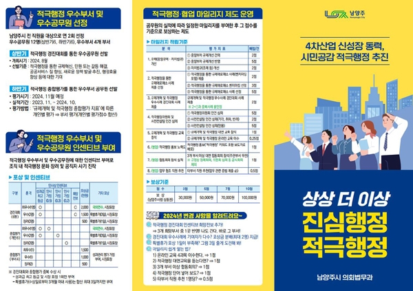 시는 기준 실적에 일정한 마일리지를 부여한 후 그 점수에 따라 보상하는 적극행정․협업 마일리지 제도를 운영하며, 보상으로 남양주사랑상품권을 지급해 지역경제에도 도움이 되도록 할 계획이다.