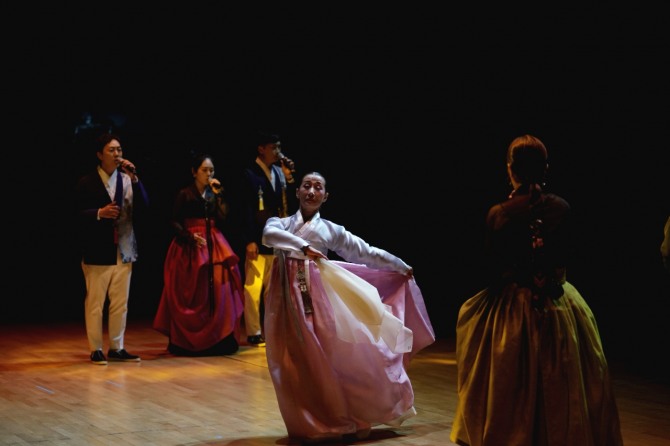 소리가 무르 익어가면, 분홍치마 노랑 저고리의 박경랑은 버선발에 수건과 꽃을 들고 춤을 추다가 객석을 향해 꽃을 나눠주는 퍼포먼스를 진행한다. 토리스는 소리, 의상, 입담으로 팬들에게 서비스하고, 박경랑은 ‘교방소반춤’ 등으로 어울림의 자리를 확장한다. 머리에 인 복분자가 관객에게 서비스되고, ‘옹헤야’, ‘쾌지나칭칭나네’는 관객과 하나가 되는 절정의 민요였다. 박경랑의 소반은 북이 되고, 비녀는 채가 되어 춤판이 이루어지고, 동화나 꿈같은 부산에서의 놀이는 열정 풍류였거나 한국식 탱고가 되었다.