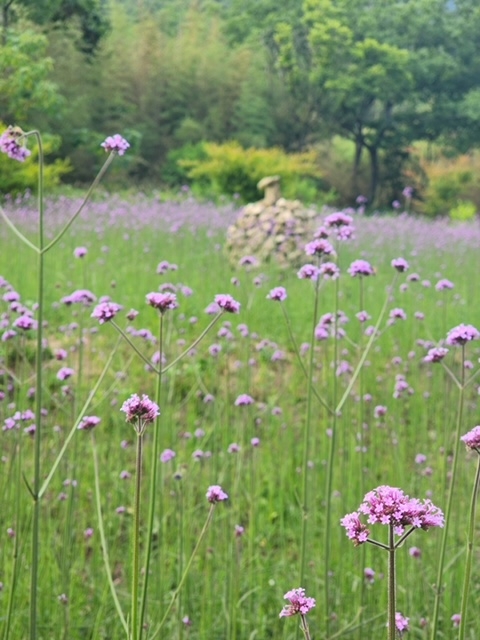 안골 계곡 숲이 주는 편안함과 대지에 펼쳐진 산책로 사이로 활짝 핀 꽃들이 장관을 이룬다. 버들마편초는 5월 말 꽃이 피기 시작하여 7월까지 보랏빛 꽃을 감상할 수 있다.