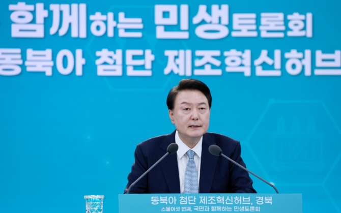 윤 대통령은 “경북이 새롭게 도약하기 위해서는 무엇보다 산업구조 혁신이 중요하다”면서 “8000억 원 규모의 동해안 ‘수소경제 산업벨트’ 조성 사업을 지원해 경북을 ‘수소산업의 허브’로 키우겠다”고 밝혔다. 이어 “원전산업 성장 펀드 조성과 기술개발, 시제품 제작 등 인프라 확충을 통해 경주에 3000억 원 규모의 SMR 국가산업단지’ 조성을 지원하겠다”고 덧붙였다.