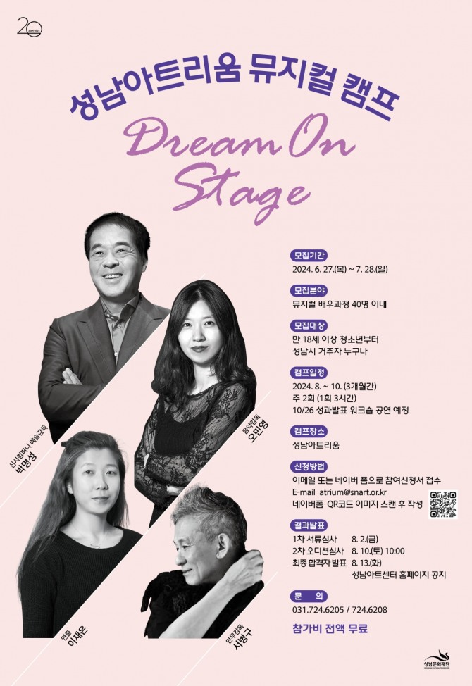 뮤지컬 캠프 ‘Dream On Stage’는 18세 이상 성남시 거주자로 뮤지컬에 관심이 있다면 누구나 신청할 수 있으며, 오디션을 거쳐 오는 8월부터 3개월 간 주 2회 뮤지컬 전문가들과 함께하는 트레이닝 과정을 거친다. 오는 10월에는 성남아트리움 무대에서 참여자들이 직접 뮤지컬 하이라이트 공연으로 그 성과를 관객들 앞에서 직접 선보일 예정이다.