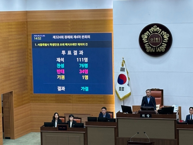 이미지 확대보기서울시의회는 25일 제324회 정례회 제4차 본회의를 열고 서울 학생인권조례 폐지조례안 재의의 건을 재석 의원 111석 중 찬성 76석, 반대 34석, 기권 1석으로 가결했다.