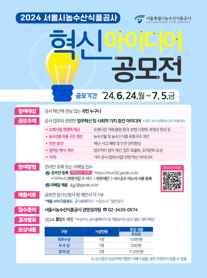 공모는 ‘도매시장 경쟁력 제고’, ‘농수산물 유통구조 개선’,‘안전·보건’, ‘일하는 방식 개선’과 ‘기타 혁신’5개 분야로 진행하며, 공사 혁신에 관심 있는 국민이면 누구나 참여할 수 있다.
