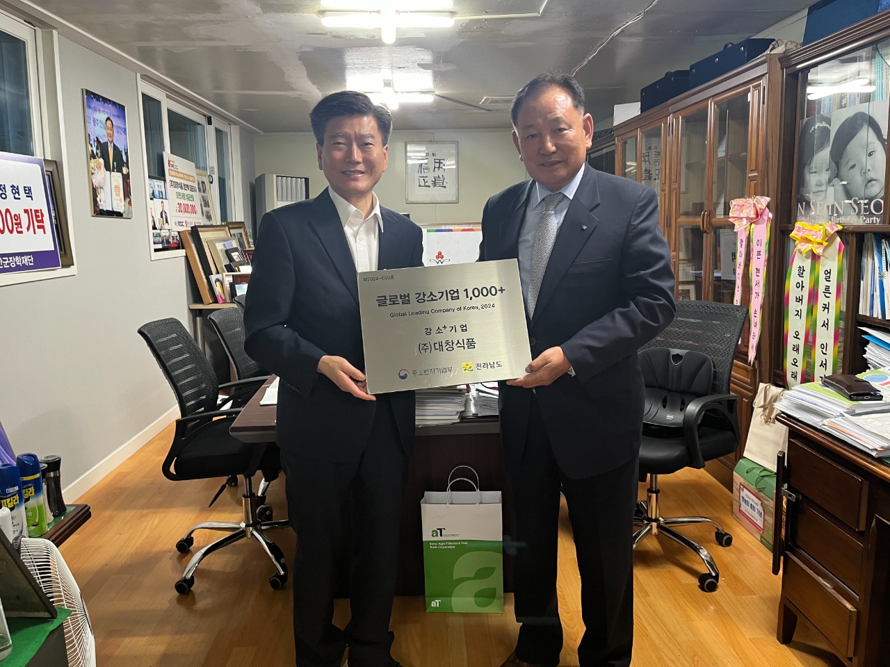중소벤처기업부 광주·전남지방중소벤처기업청은 지난 25일 2024년도 글로벌 강소기업 1000+에 선정된 ㈜대창식품을 방문해 지정서 및 현판 수여식을 가졌다.