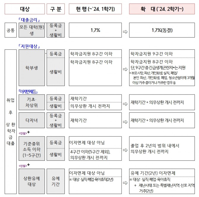 아울러 전날(1일)부터 ‘취업 후 학자금 상환 특별법’이 시행되면서, 2학기부터는 학자금 대출 이자 면제 대상이 확대된다.
