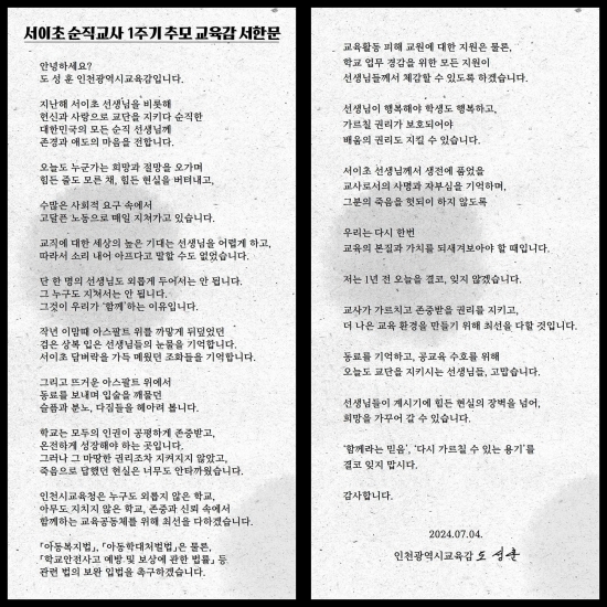 이미지 확대보기도 교육감은 서이초 교사 순직 추모 서한문을 일선 학교에 보냈는데 “작년 이맘때 아스팔트 위를 까맣게 뒤덮었던 검은 상복 입은 선생님들의 눈물을 기억한다”라고 적시했다.
