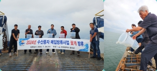 이미지 확대보기이번 방류된 어린 꽃게는 갑폭1cm 이상의 인천시 수산자원연구소에서 수산생물 전염병 검사를 마친 건강하고 활력이 좋은 우량 꽃게로, 영흥수산업협동조합장, 어촌계장, 영흥선단회 선단장 등의 입회하에 큰 관심 속에 방류됐다.