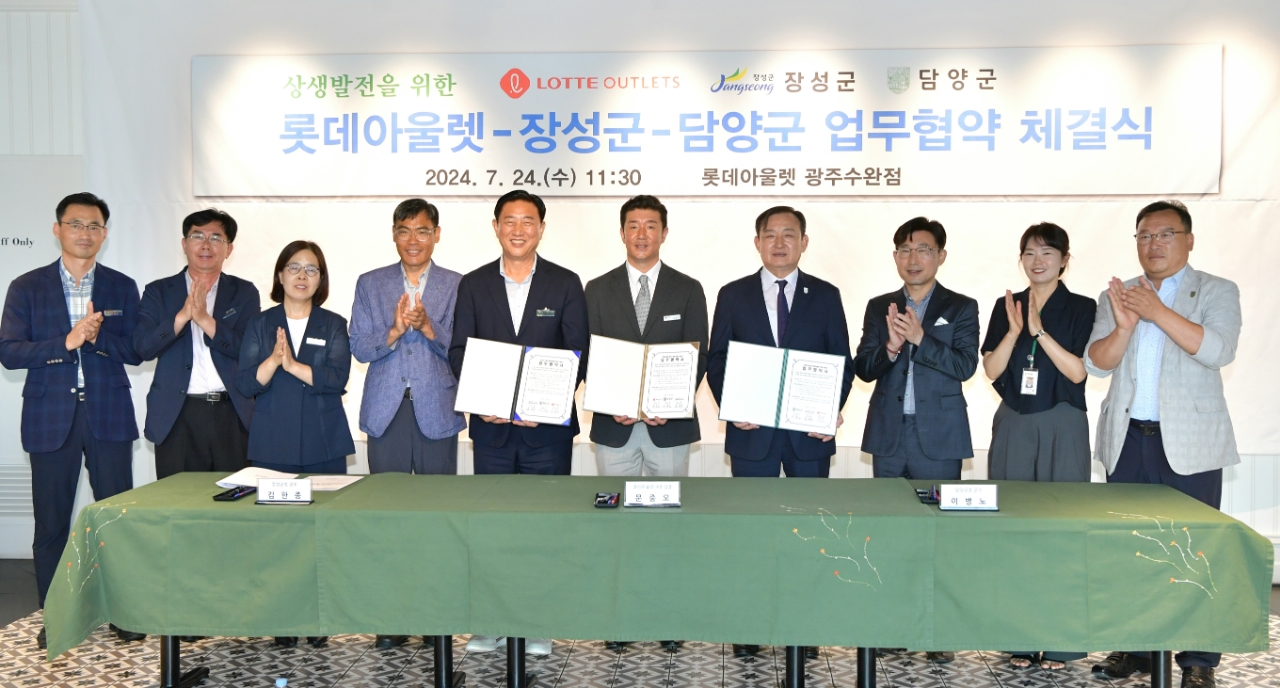 이미지 확대보기담양군(군수 이병노)은 지난 24일 광주광역시 롯데아울렛 수완점에서 열린 ‘도농교류 활성화 및 지역상생 협약식’을 통해 이병노 담양군수와 김한종 장성군수, 문중오 롯데아울렛 광주수완점장이 3자 협약을 맺고 지역 농특산품 판매 확대와 상생발전을 위한 협력체계 구축에 손을 맞잡았다고 25일 밝혔다.