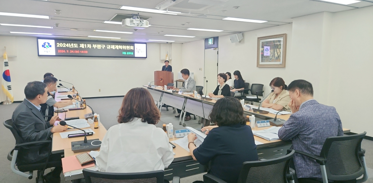 이미지 확대보기지난 24일 부평구 윤백진 부구청장과 규제개혁위원회 위원 등 총 8명이 참석한 가운데 ‘2024년 제1차 규제개혁위원회’를 개최했다고 25일 밝혔다.