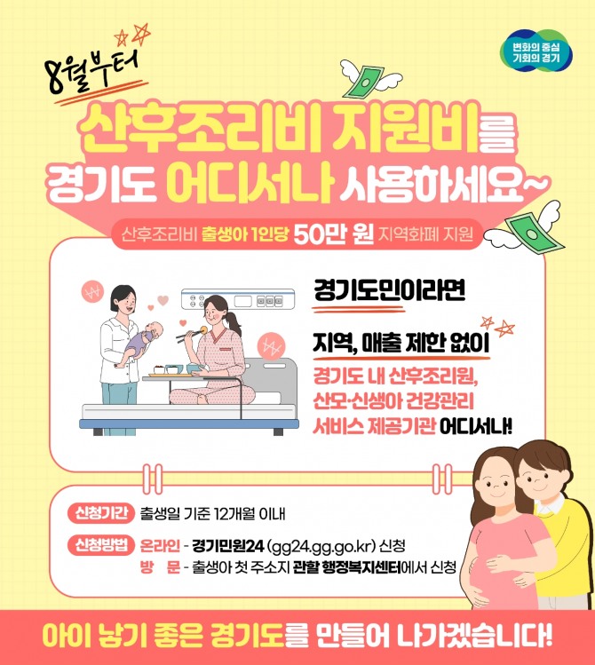 이에 도는 지난 6월 ‘경기지역화폐심의위원회’를 열고 산후조리비를 지역에 상관없이 사용할 수 있도록 제도를 개선했다. 산모·신생아 건강관리 서비스 제공기관에 대한 기존 매출액 10억원 기준 제한도 폐지했다.
