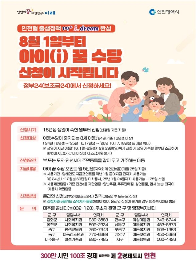 오는 8월 1일부터는 ‘아이 꿈 수당’ 신청이 개시되면서 인천시의 사업이 이제 본격적으로 ‘1억+i dream’ 가동된다. 아이 꿈 수당은 2024년생 아동이 8세가 되는 2032년부터 18세까지 매월 15만 원을 지원하는 정책이다.