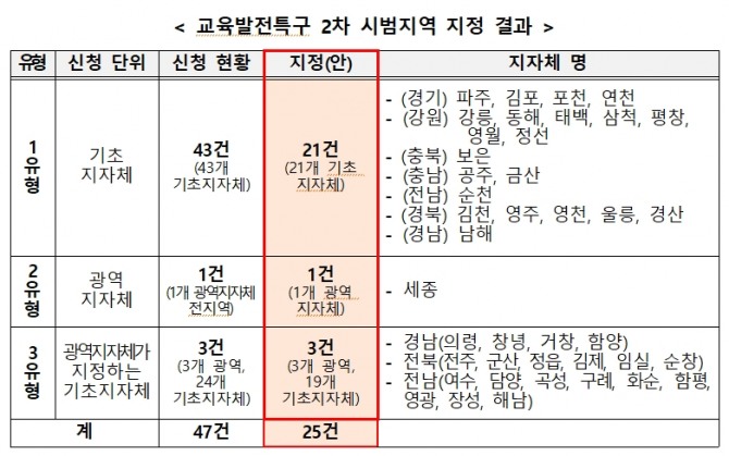 이미지 확대보기교육부와 지방시대위원회는 30일 교육발전특구 2차 시범지역을 이같이 선정했다고 밝혔다.