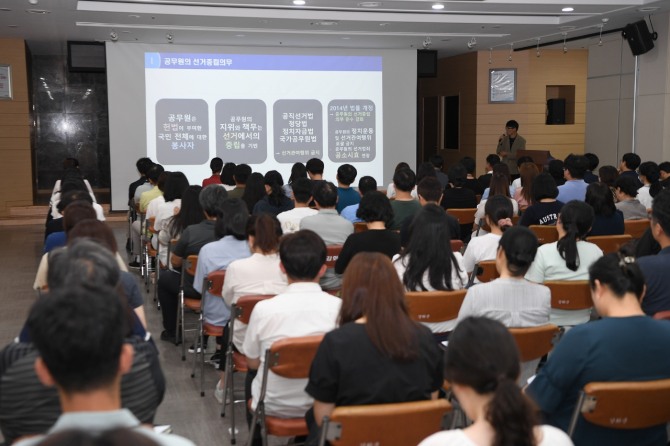 이미지 확대보기군 공무원 150여 명이 참석한 이날 교육에서는 이양모 강화군 선거관리위원회 지도계장이 강사로 나서 △공무원의 선거중립의무 △공무원의 선거관여 금지 △업무추진 관련 제한 금지 △SNS 활용 관련 유의사항 등 공무원이 꼭 알아야 할 사례 중심으로 알기 쉽게 교육을 진행했다.