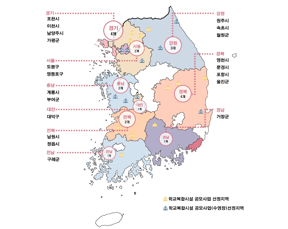 공모심사위원회가 공모에 신청 접수된 28개 사업 가운데 지역 여건과 수요, 사업계획의 타당성을 종합적으로 고려해 최종 20개 사업을 선정했다. 수영장 11개, 다목적체육관 11개, 도서관 4개, 늘봄시설 11개 등이 뽑혔다.