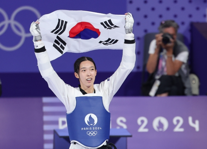 이미지 확대보기김유진은 9일(이하 한국시각) 프랑스 파리의 그랑팔레에서 열린 2024 파리 올림픽 태권도 여자 57kg급 결승전에서 이란의 나히드 키야니찬데를 이겨 금메달을 목에 걸었다.