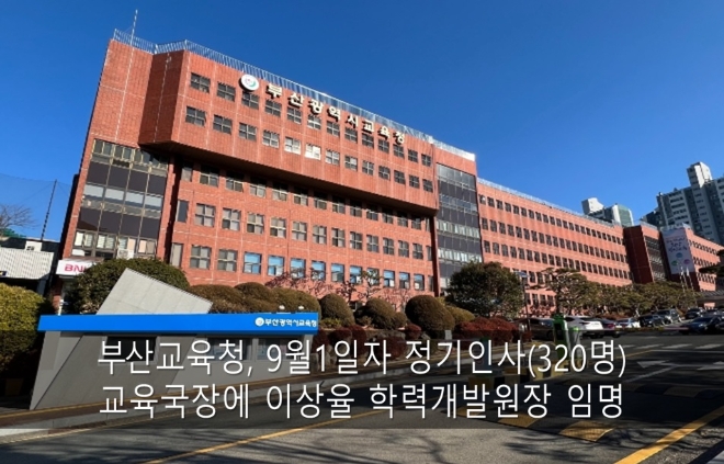 이번 인사에서 교육국장에는 이상율 학력개발원장을 임명했다. 남부교육지원청 교육장에 천은숙 교육연수원장, 동래교육지원청 교육장에 하승희 시교육청 유초등교육과장, 해운대교육지원청 교육장에 박지훈 시교육청 교육정책과장을 각각 발령했다.