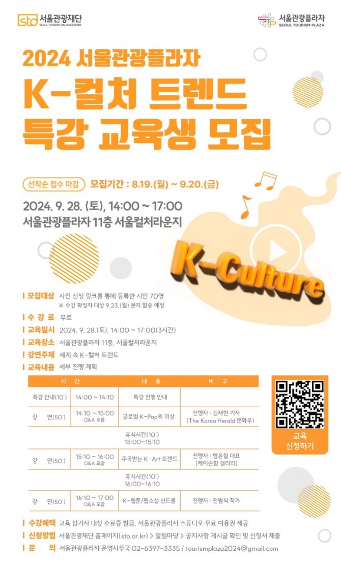 교육은 ‘서울관광재단’ 누리집‘알림마당 - 공지사항’ 탭에서 확인할 수 있으며, 관련해 세부적인 내용은 서울관광플라자 운영사무국을 통해 문의할 수 있다.