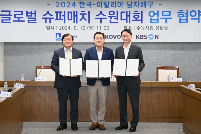 수원시와 한국배구연맹, KBSN은 19일 수원시청 상황실에서 업무협약을 체결하고, ‘2024 한국·이탈리아 남자배구 글로벌 슈퍼매치 수원대회’의 성공적인 개최를 위해 협력하기로 했다.