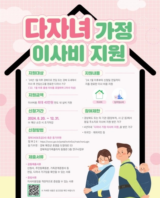 이사비 지원 대상은 2024년 1월 이후 경북으로 전입했거나 도내에서 이사한 가구로, 2022년 1월 이후 출생한 자녀를 포함해 2명 이상의 자녀를 둔 다자녀 가정이다.