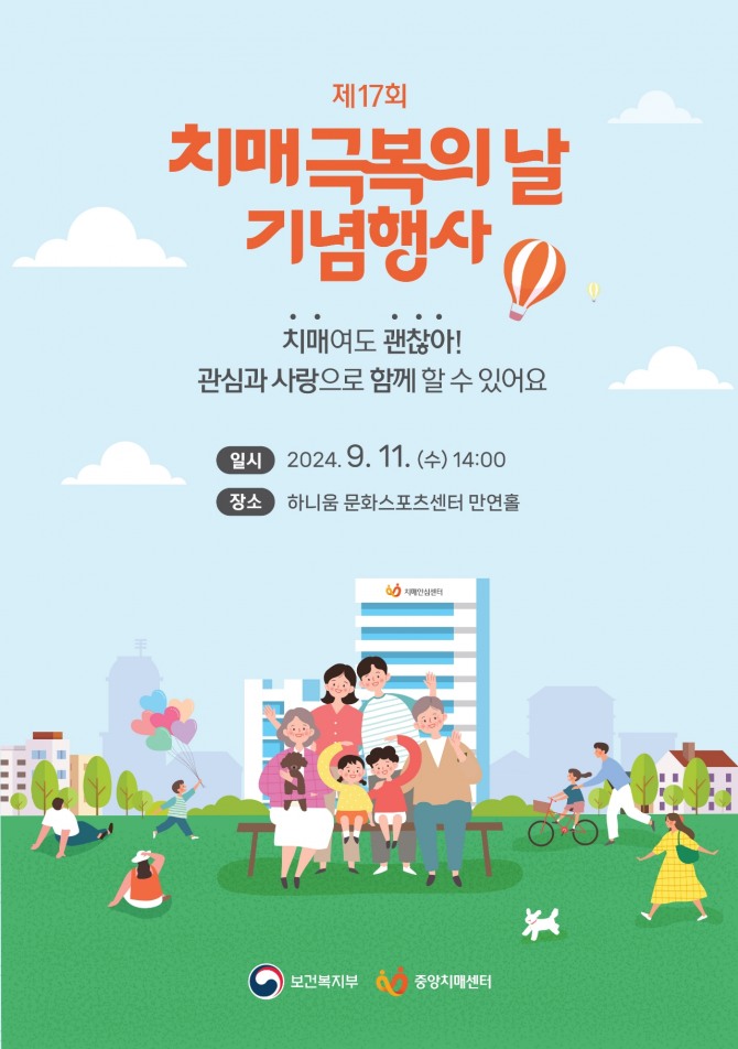 기념식은 밴드 ‘파람’의 축하공연, 개회사, 치매유공자 표창, 공모전 시상, 기념사, 환영사, 축사, 치매 극복의 날 기념 퍼포먼스 순으로 진행될 예정이다.