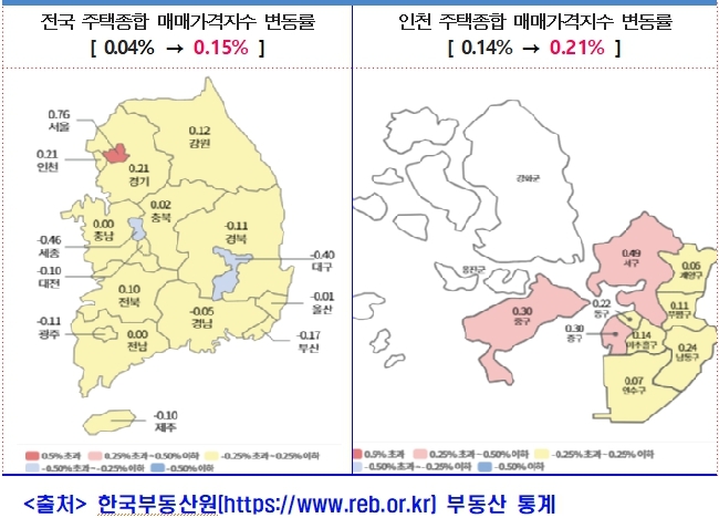 지역별로는 서구가 0.49%로 가장 높고, 중구 0.30%, 남동구 0.24%, 동구 0.22%, 미추홀구 0.14%, 부평구 0.11%, 연수구 0.07%, 계양구 0.06% 등 순으로 상승세가 지속 중이다.