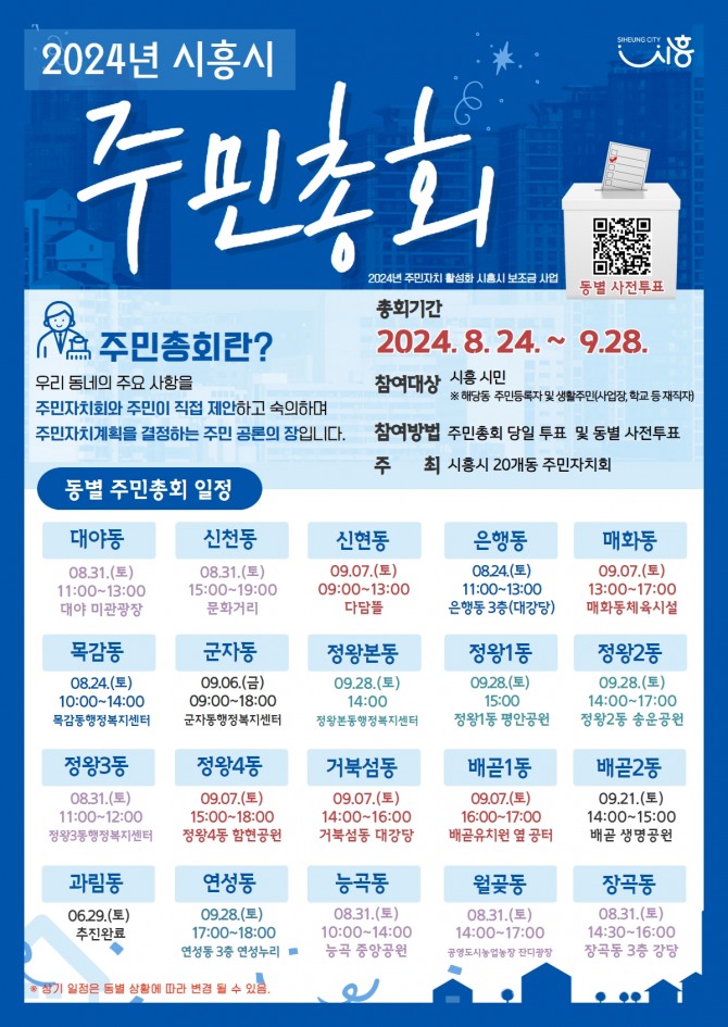각 동 주민총회 일정은 △8월 24일 목감동, 은행동 △31일 능곡동, 정왕3동, 대야동, 월곶동, 장곡동, 신천동 △9월 6일 군자동 △7일 신현동, 매화동, 거북섬동, 정왕4동, 배곧1동 △21일 배곧2동 △28일 정왕본동, 정왕2동, 정왕1동, 연성동 순으로 열릴 예정이다.