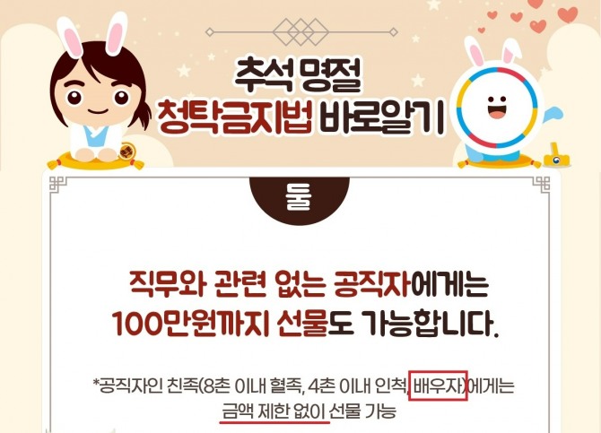 이미지 확대보기권익위는 21일 추석명절 청탁금지법 관련 카드뉴스를 공개했다. 여기에는 △친구·친지 등 공직자가 아닌 사람에게 주는 명절 선물은 금액 제한 없이 얼마든지 줄 수 있다. △직무와 관련 없는 공직자에게는 100만원까지 선물도 가능 △직무와 관련 있는 공직자에게는 원활한 직무수행, 사교·의례 목적으로 주는 선물은 5만원까지 가능 △직무 관련 공직자에게 선물로 줄 수 있는 상품권은 특정한 물품 또는 용역의 수량이 기재된 물품 또는 용역상품권(금액상품권은 제외)만 가능 △올해 8월 27일부터 직무 관련 공직자와 함께 하는 음식물 가액이 3만원에서 5만원으로 상향 등 여러 상황별 내용이 적혀 있다.