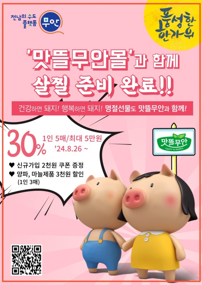 아울러 무안 대표 농산물인 양파, 마늘 제품 구매 시 3천 원 할인 쿠폰이 1인당 3매 제공되며, 신규회원 2천 원 쿠폰 지급 및 카카오톡 채널 추가 2000원 쿠폰도 추가로 지급된다.