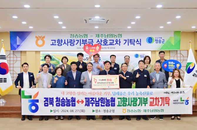 이미지 확대보기이날 제주남원농협 임직원 117명은 1170만원(인당 10만원씩)을 청송군에 기부하며 고향사랑의 마음을 전했다. 이번 기부는 지난 7월 청송농협 임직원들이 제주특별자치도에 기부한 1000만원에 대한 상호교류행사의 일환이다.