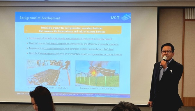 이날 김제은 유시티 대표는 "UCT배터리는 기존 리튬 이온 배터리와 달리 전자기 물리적 충전 방식을 사용해 화학 반응이 필요하지 않아 폭발이나 화재의 위험이 현저히 낮다"고 강조했다.