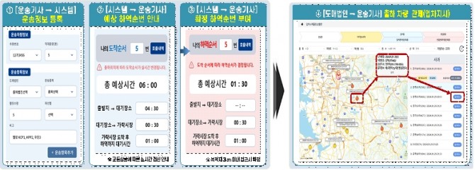 이미지 확대보기특히 사과, 배 등 성수기 품목의 출하 차량을 대상으로 스마트 입차 스케줄링 서비스를 제공하여 하역 순번을 부여하고, 대기 시간을 최소화할 계획이다. 운송 기사는 스마트폰 앱을 통해 운송 정보를 등록하고, 가락시장 인근에 도착하면 하역 순번을 받아 경매장에서 바로 하역할 수 있게 된다. 이를 통해 시장 내 혼잡을 줄이고 물류 효율을 높일 것으로 기대된다.