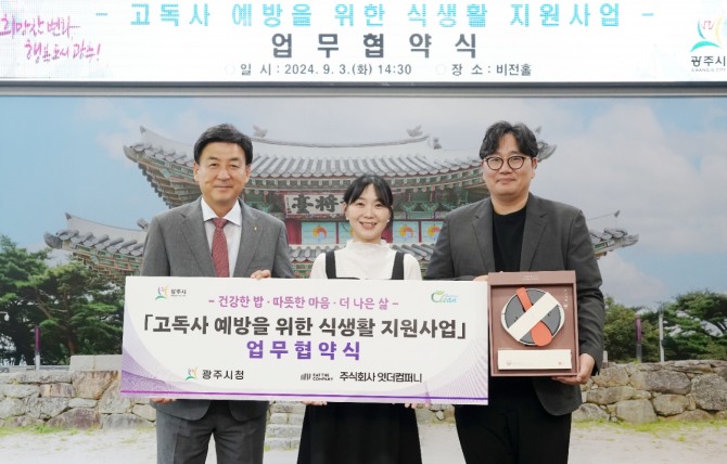 지난 7월 광주시가 고독사 사업의 일환으로 ㈜잇더컴퍼니의 끼니키트 45세트를 구입한 것을 눈여겨 본 김봉근 잇더컴퍼니 대표가 광주시에 직접 연락, 고독사에 대한 관심과 지원을 약속하면서 이번 협약을 성사시켰다.