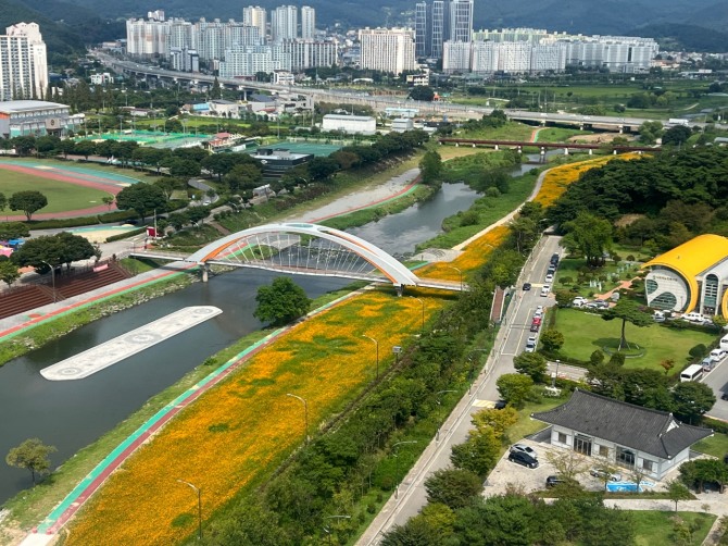 이미지 확대보기이번 화순천 가을 꽃강길은 음악분수부터 학사리보, 벌고천까지 이어지며 지난 8월에 파종한 노란 황화코스모스와 분홍색의 왜성코스모스가 풍성한 경관을 선사하고 있다.