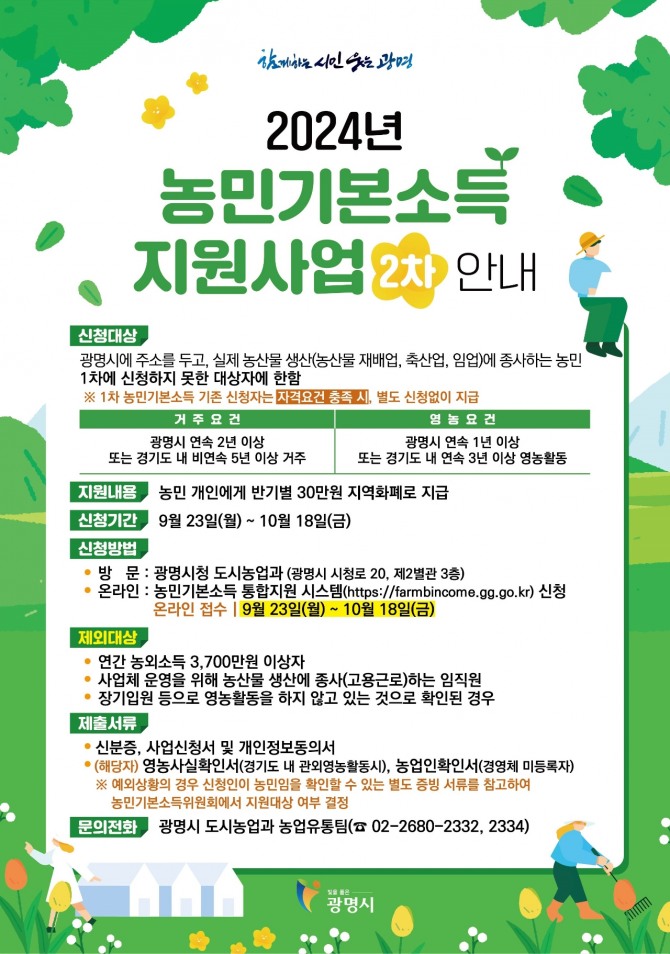 시 관계자는 “2024년 농민기본소득 지원사업은 이번 2차 접수가 마지막”이라며 “아직 신청하지 못한 농민의 많은 신청 바란다”고 당부했다.