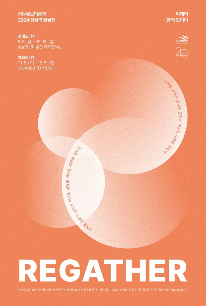 성남문화재단 창립 20주년을 기념해 기획된 이번 성남의 얼굴전은 ‘조각’이라는 한 장르에 집중해 창작 활동을 해온 작가들의 그룹 전시로 진행된다. 전시명인 ‘리게더 : REGATHER’는 ‘다시 한데 모이다’의 뜻으로, 사람과 사람, 작품과 공간, 그리고 예술과 관람객이 한데 모여 엮이는 과정을 담는다.