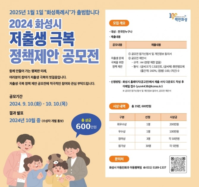 정명근 화성시장은 “이번 공모전을 통해 시민 여러분의 다양한 의견을 반영하여 실효성 있는 저출생 극복 정책을 만들어 나가겠다”며 “많은 분들의 참여를 부탁드린다”고 밝혔다.