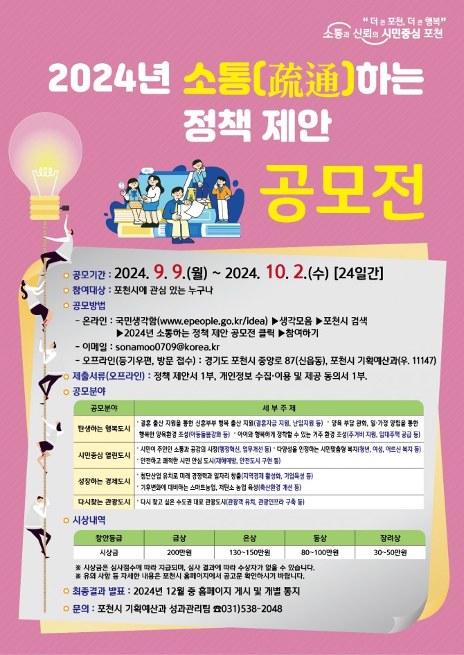 공모 분야는 탄생하는 행복도시, 시민중심 열린도시, 성장하는 경제도시, 다시찾는 관광도시 등 4개 분야로, 포천 시정에 관심 있는 국민이라면 누구나 응모 가능하다.