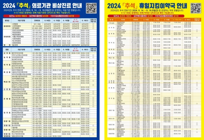 추석 명절 연휴 기간 중 비상 진료에 관한 내용과 인근지역 당직의료기관 및 휴일 지킴이 약국 연락처에 관한 정보는 응급의료정보센터 누리집, 시흥시 누리집과 스마트폰 앱(App) ‘응급의료정보제공’ 및 홍보물의 큐아르(QR) 코드를 통해 확인할 수 있다.