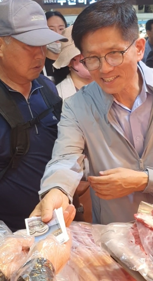 이날 김 장관은 시장 화폐로 추석용 고기를 구입하고 시장관계자에게 보여주며 "추석 장사 잘되시라고 많이 샀다" 라고 덕담을 건냈다.