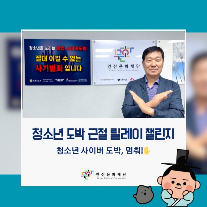 안산시청소년재단으로부터 참여 지목을 받은 이성운 안산문화재단 대표이사는 “청소년 사이버 도박의 심각성이 날로 커지고 있는 현재, 가장 필요한 건 우리 사회가 청소년 사이버 도박의 위험성을 인지하고 더욱 경각심을 가지는 것”이라며, “청소년이 건강한 삶을 살 수 있도록 안산문화재단이 가진 문화예술자원을 이용하여 아낌없이 지원할 계획”이라고 전했다.