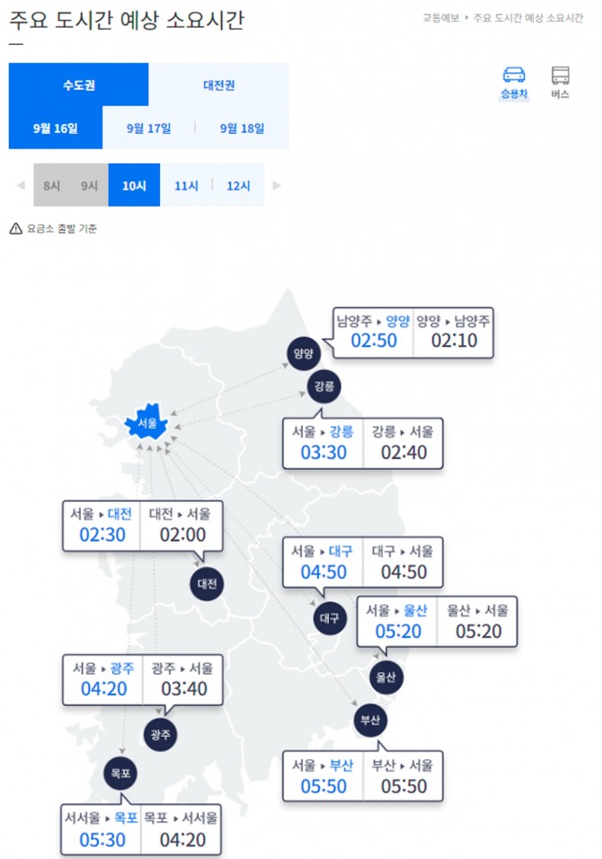 이미지 확대보기16일 한국도로공사에 따르면 이날 오전 10시 기준 승용차로 서울 요금소를 출발해 전국 주요 도시까지 걸리는 시간은 부산 5시간50분 울산 5시간 20분, 목포 5시간30분, 대구 4시간 50분, 광주 4시간20분, 대전 2시간30분, 강릉 3시간30분이다.