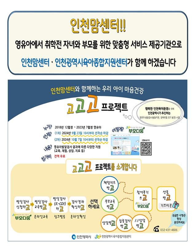 인천광역시는 영유아 자녀와 부모를 위해 시기별 맞춤형 서비스를 제공하는 ‘인천맘센터'에서 ‘고고고 프로젝트’ 대상자를 모집한다고 19일 밝혔다.인천맘센터는 민선 8기 선거공약으로 올해 8월 인천광역시육아종합지원센터에 위탁 운영 중이며, 코로나19 이후 언어나 사회성 발달이 늦어진 아이들이 증가한 상황을 반영하여 시범사업으로 ‘고고고 프로젝트’를 추진하고 있다.