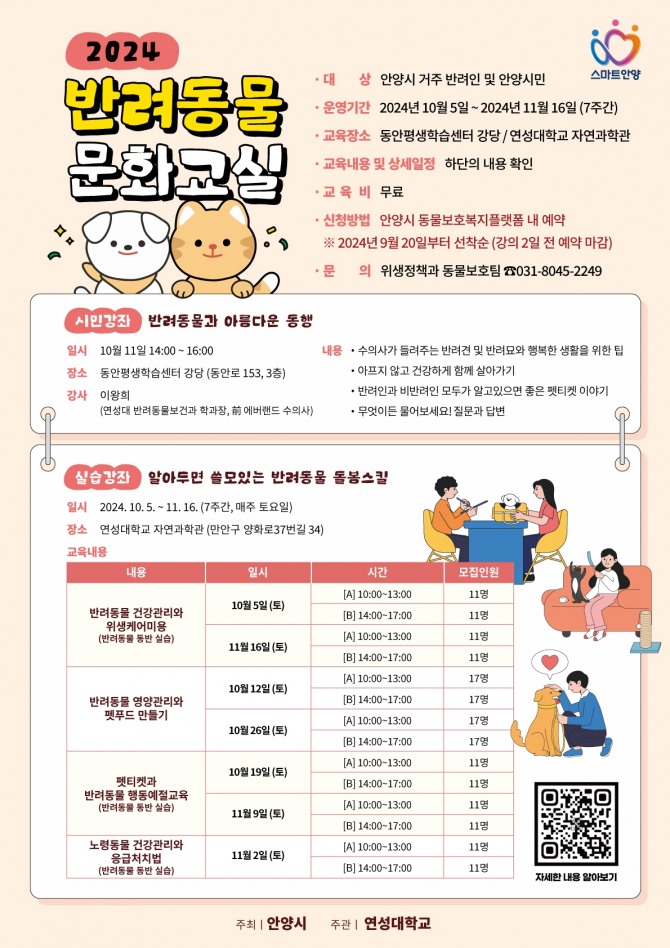신청은 안양시민이라면 누구나 강좌를 신청할 수 있고, 오는 20일부터 시 동물보호복지플랫폼에서 선착순으로 진행된다. 다만, 시민강좌의 경우에는 당일 현장 접수로도 참여할 수 있다.