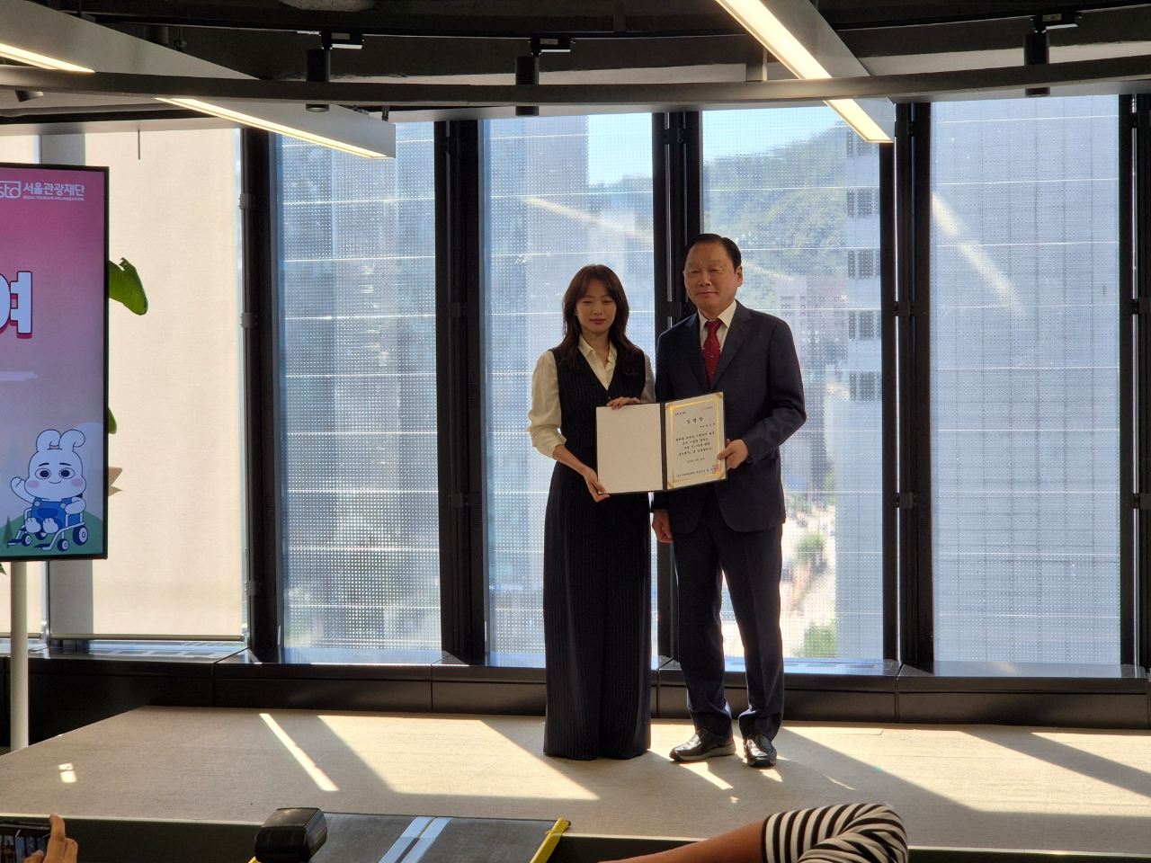천우희는‘서울다누림관광’캐릭터‘다님이’의 휠체어를 밀고 함께 무대에 오르는 훈훈한 광경을 자아내 눈길을 끌었다.