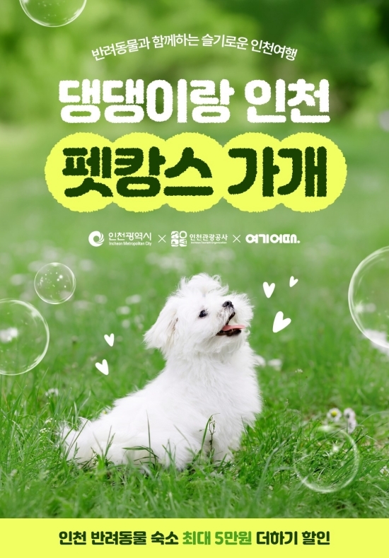 인천광역시와 인천관광공사는 증가하는 반려동물 동반 여행객들을 위해 국내 대표 여행·여가 플랫폼 ‘여기어때’와 함께 인천 반려동물 동반 온라인 숙박상품 기획전을 23일부터 10월 20일까지 개최한다고 24일 밝혔다.이번 기획전의 테마는 ‘댕댕이랑 인천 펫캉스 가개’로 인천 내 반려동물과 함께 숙박할 수 있는 호텔, 펜션 등 약 90여 곳의 다양한 시설을 소개하고 할인쿠폰을 제공할 예정이다.
