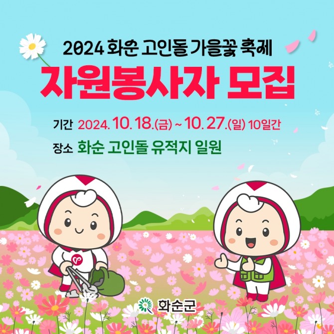 이미지 확대보기전남 화순군(군수 구복규)은 '2024 화순 고인돌 가을꽃 축제' 자원봉사자를 30일까지 모집한다고 25일 밝혔다.