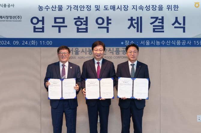 서울시농수산식품공사(사장 문영표, 이하 ‘공사’)가 서울농산물도매시장정산(주) (공동대표 정환수·강민규, 이하 ‘정산회사’)·NH농협은행(은행장 이석용, 이하 ‘농협’)과 가락시장의 유통혁신 및 정산시스템 고도화를 위한 업무협약을 24일 체결했다고 밝혔다.