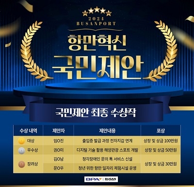 우수상에는 ‘미디어 아트 등 디지털 기술을 적극 활용한 해양관광 스폿 개발’(권*미), 장려상에는 ‘청각 장애인을 위한 문의 톡 서비스 신설(김*남)’과 ‘우리 청년을 위한 항만 일자리 체험 시설 운영(문*우)’이 각각 선정됐다.