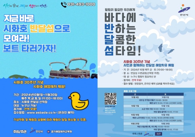 이미지 확대보기시는 시화호 30주년을 기념하기 위해 해양여건이 우수한 반달섬에서 동력수상레저기구 등을 체험할 수 있는 해양레저 체험을 추진한다. 또한, 시가 가진 해양자원을 널리 알리고 시민 행복과 웰빙을 위한 해양치유 체험도 진행된다.